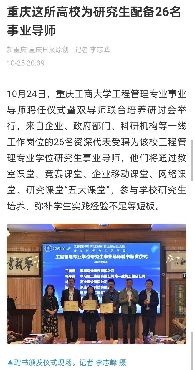 2、华龙网:《26位“事业导师”上任!太阳网集团tcy8722工程管理专业学位研究生实行“双导师”培养新模式》