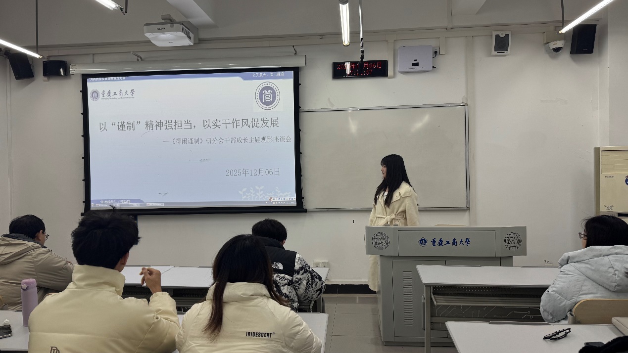 观后感交流环节在明智楼110417教室开展。宣传部部长刘文担任主持人并抛出“影片中哪一情节最能体现‘谨制’精神”、“‘严真细实快’的工作作风如何具象化”等问题,以激发研分会成员的表达热情。