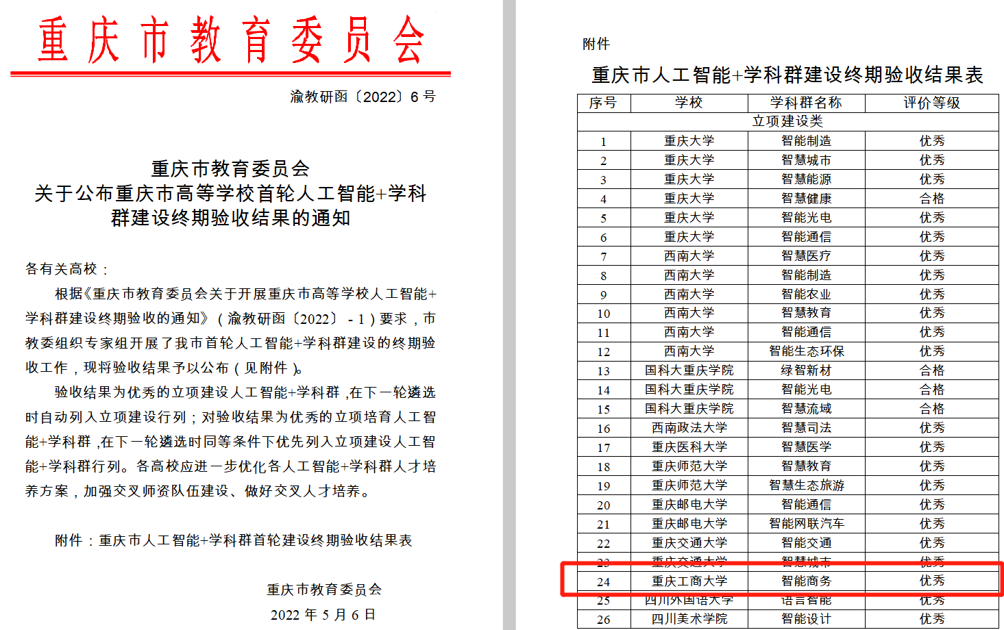 2022年5月6日,重庆市教育委员会公布了重庆市高等公司首轮人工智能+学科群建设终期验收结果,公司牵头建设的“智能商务”学科群验收结果荣获优秀,这表明公司“智能商务”学科群将在下一轮遴选时,自动进入立项建设行列。