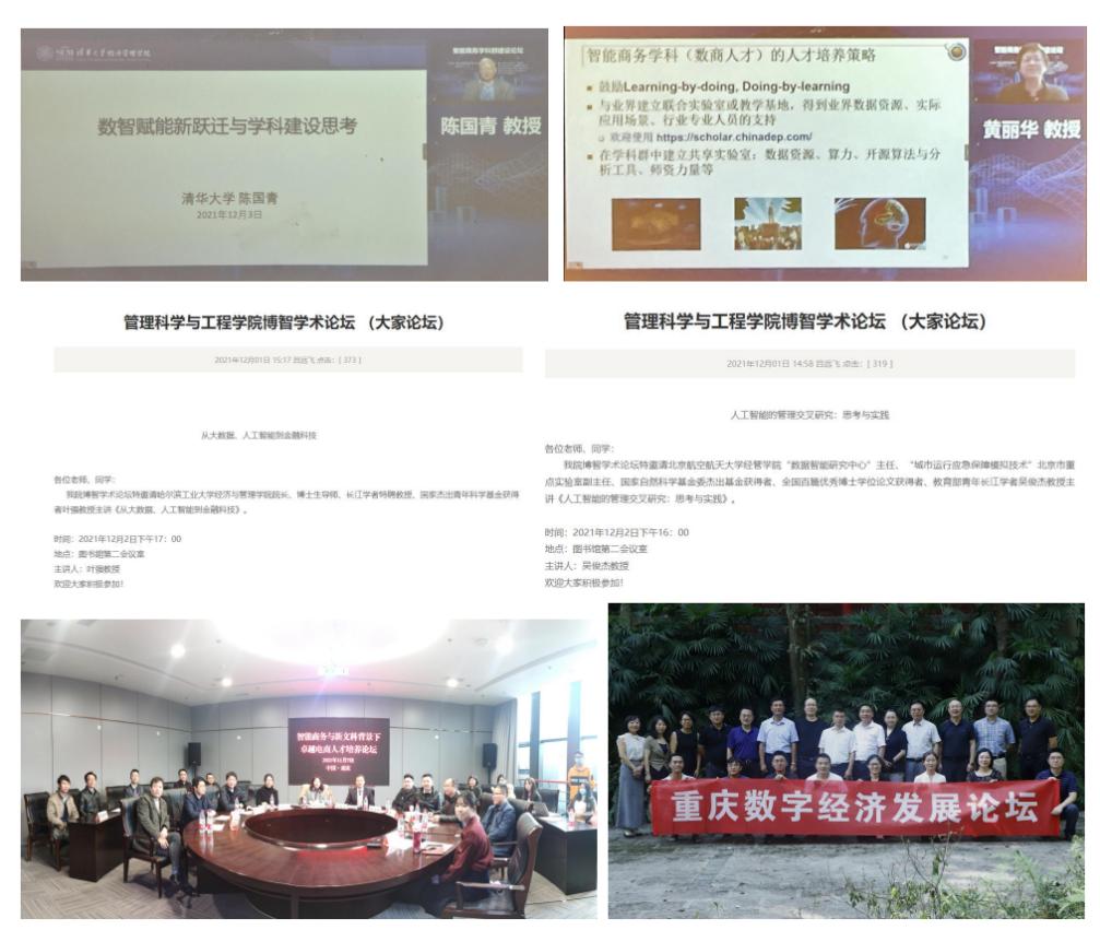 “智能商务”学科群由公司牵头建设,经理黄钟仪教授担任学科群负责人。建设过程中,学科群及时回应国家和重庆市的重大需求,构建了智能预测与决策、电子商务智能运营、智慧物流与路径优化、智能推荐与精准营销、智能财务与审计、智能商务模式创新等六个特色鲜明的学科方向;围绕学科方向,“内培外引”高层次人才,通过“特色引领工程”、“高峰建设工程”、“拔尖选拔工程”和“国际影响力提升工程”等举措,形成了由“学科带头人-方向带头人-学术骨干”三层次梯队构成的教师队伍;以交叉复合、管工融通为指导方针推进智能商务学科群的人才培养体系改革与优化,着力培养皆具智能与商务能力的创新型复合型高层次专门人才;搭建了五个省部级科研创新及成果转化平台,举办了一系列智能商务有关的论坛、讲座以及学术会议,产出了一批高水平的创新成果,出版了一批商工融合的教材,开展了一系列社会服务和科技推广活动,为重庆市智能化、智慧化商务的发展贡献了智慧和力量。