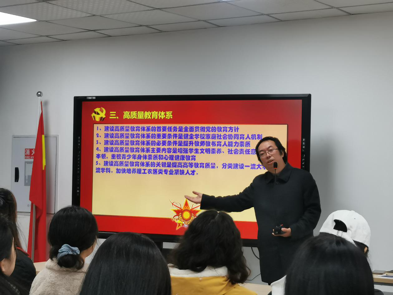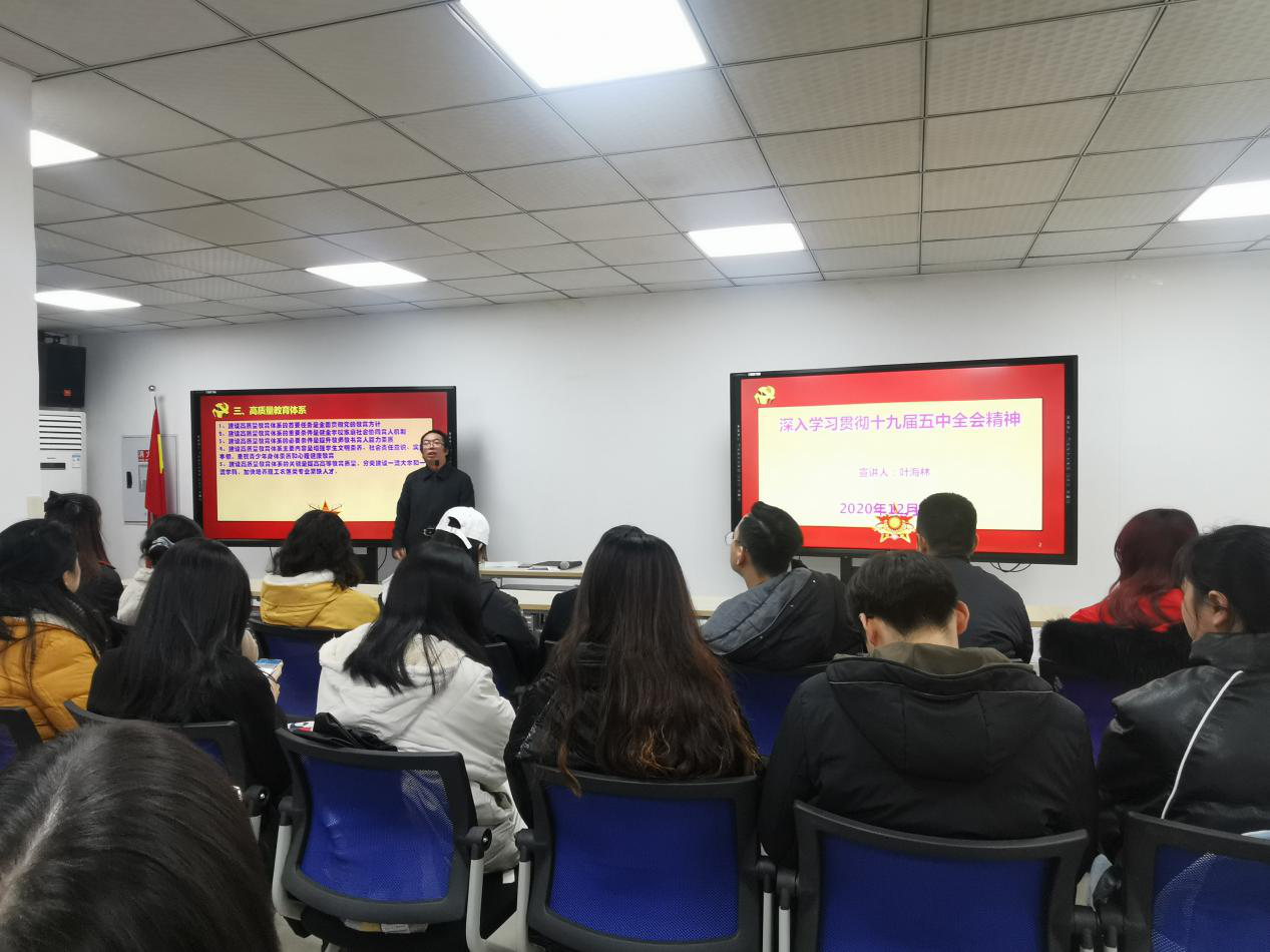 下午13时,宣讲会准时开始。叶海林分别从十九届五中全会概述、治理体系、高质量教育体系和“绝知此事要躬行”四个方面展开宣讲。叶海林首先介绍了十九届五中全会召开的基本情况,这次会议的召开,是对未来的期待,也是对未来的憧憬。在概论中,叶海林主要从一个新奋斗目标、统筹好发展和安全两件大事、三个“新”、“四个全面”新布局、五大新发展理念和六个发展目标展开讲述。着重强调治理体系和高质量教育发展这两方面的内容。他指出,“体系”一词在十九届五中全会审议通过的《建议》中共出现了108次,这是对我国新时代治理体系的进一步落实,是党中央坚持系统谋划、统筹推进党和国家各项事业的具体化。同时他也谈到,要全面贯彻党的教育方针,建设高质量教育体系,健全公司家庭社会协同育人机制。在教育过程中,要注重公司一流学科的建设,更要注重员工生理和心理的发展。最后,叶海林希望同学们平时做事时认真细心,要让自己做的、写的东西经得起检验。