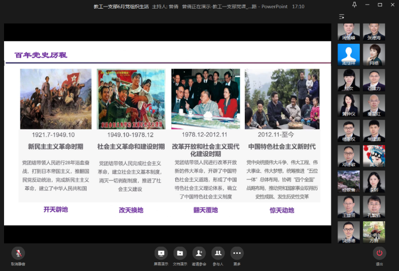 推动党史学习教育常态化制度化。教工一支部严格贯彻“三会一课”制度,开展教工党员上党课活动等。截止目前,共召开支部党组织生活12次,共有36名党员代表发言分享党史学习体会。支部上党史学习教育专题党课3次,分别由公司党委书记邓德敏同志讲《四渡赤水出奇兵》、支部书记曾倩同志讲《中国共产党百年探索之路》党课、支部纪检委员石建力同志讲《以史为鉴,开创未来》学习“七一”重要讲话专题党课。