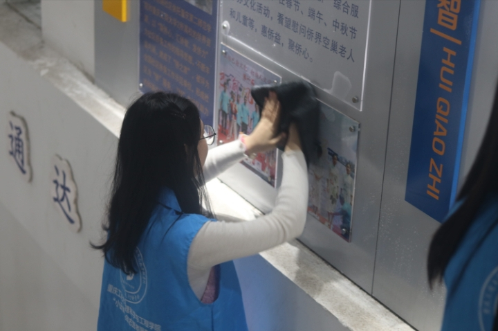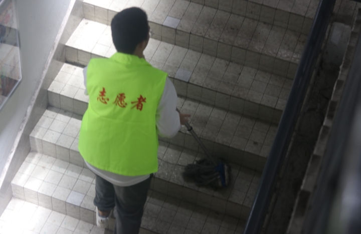 当天早上,志愿者们到达目的地换好工作服后便开始分配清洁工具,为正式的打扫工作做好准备。接着志愿者们通过帮助环卫工人捡拾垃圾,拖楼梯死角地面、擦拭栏杆、墙面污垢等方式慰问环卫工人,深度体验清洁工作,然后对清洁过后的地方再次仔细检查。最后,志愿者们在打扫干净的场地下,留下了欢喜的笑容,有幸在本次活动中体验劳动后成就感,同时体会到了环卫工人的辛苦,深知保护环境热爱卫生的重要性。
