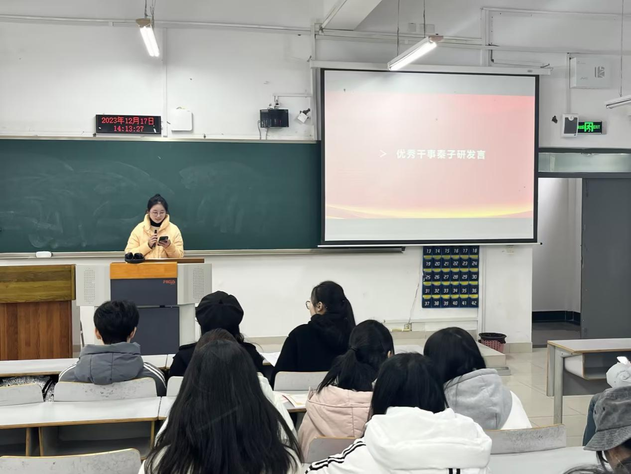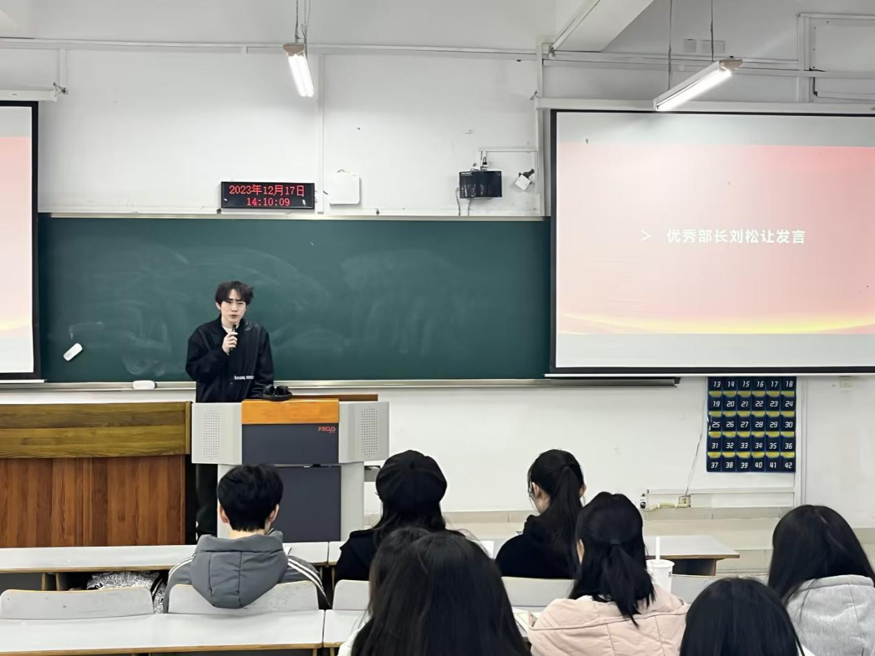 第三项议程:优秀代表发言。优秀员工助理代表邹林,优秀部长代表刘松让、董升达,优秀干事代表秦子研、程琪媛,均对这一学期的工作进行了总结,分享了自己在工作中的经验和心得,并勉励在场各位保持优良作风,延续优秀习惯。同时,完善自己的不足之处。