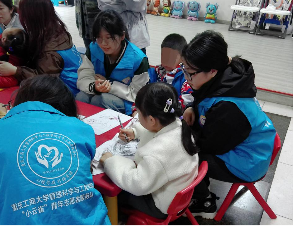 志愿者们以“一对一”形式和儿童做游戏、绘画创作和教唱儿歌。活动通过《粘泡泡糖》开场热身小游戏和绘画创作,锻炼儿童思维能力,让他们用画作表达奇思妙想。