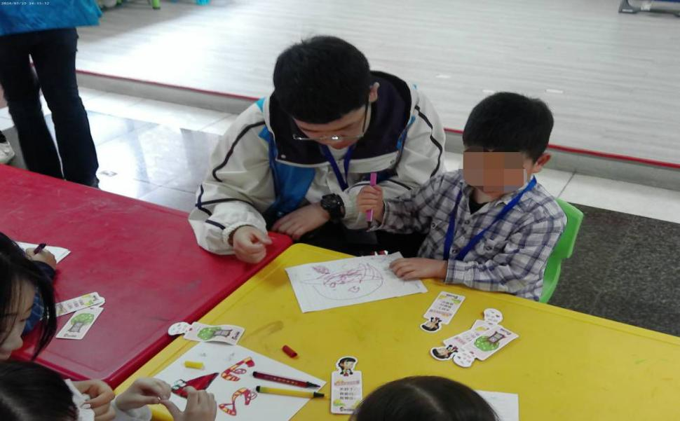 下午十四时,小朋友们在志愿者的带领下有序就坐。活动正式开始,首先小朋友们与志愿者进行了互动游戏,"找颜色"、"巧巧手"、"爆米花"等趣味环节在愉快轻松的氛围中锻炼了小朋友们的观察能力和反应能力,让孩子们在欢声笑语中感受到了快乐与关爱。紧接着是儿歌《小螺号》、《蜗牛与黄鹂鸟》,小朋友们随着歌曲的旋律时而摇头晃脑,时而拍手欢笑,稚嫩的动作满是热情与活力。此外,志愿者们还带领小朋友们开始绘画,让他们在绘画中描绘眼中世界的形状,充分展现他们的才艺和活力。