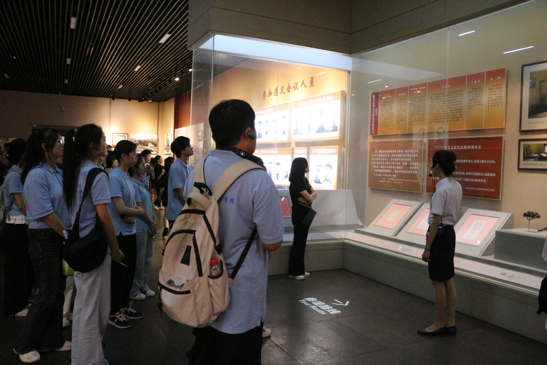 跟随场馆讲解员,实践团师生依次参观场馆,聆听毛泽东等老一辈无产阶级革命家在遵义的革命战斗故事。在这座见证了中国革命重大转折的历史建筑里,大家认真聆听讲解员的解说,仔细观看陈列的文物和图片,仿佛穿越时空,回到了那段波澜壮阔的革命岁月。从讲解员绘声绘色的讲述中,大家犹如亲身感受到了党中央在遵义会议时展现出的果敢与智慧,那伟大的改革气魄令人由衷感叹,更加深刻地体悟到“坚定信念、坚持真理、独立自主、团结统一”的遵义会议精神,