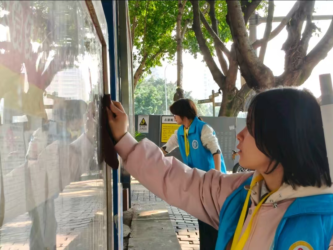 活动现场,身着志愿服的“小云雀”队员们分工明确、配合默契,手持扫帚、垃圾袋、夹子等工具,细致清理街道中的烟头、纸屑、塑料瓶等杂物,并对社区宣传栏等进行擦拭清洁,同时撕去各类小广告。尽管天气微寒,志愿者们热情不减,忙碌的身影成为初冬街头一道温暖而亮丽的风景线。