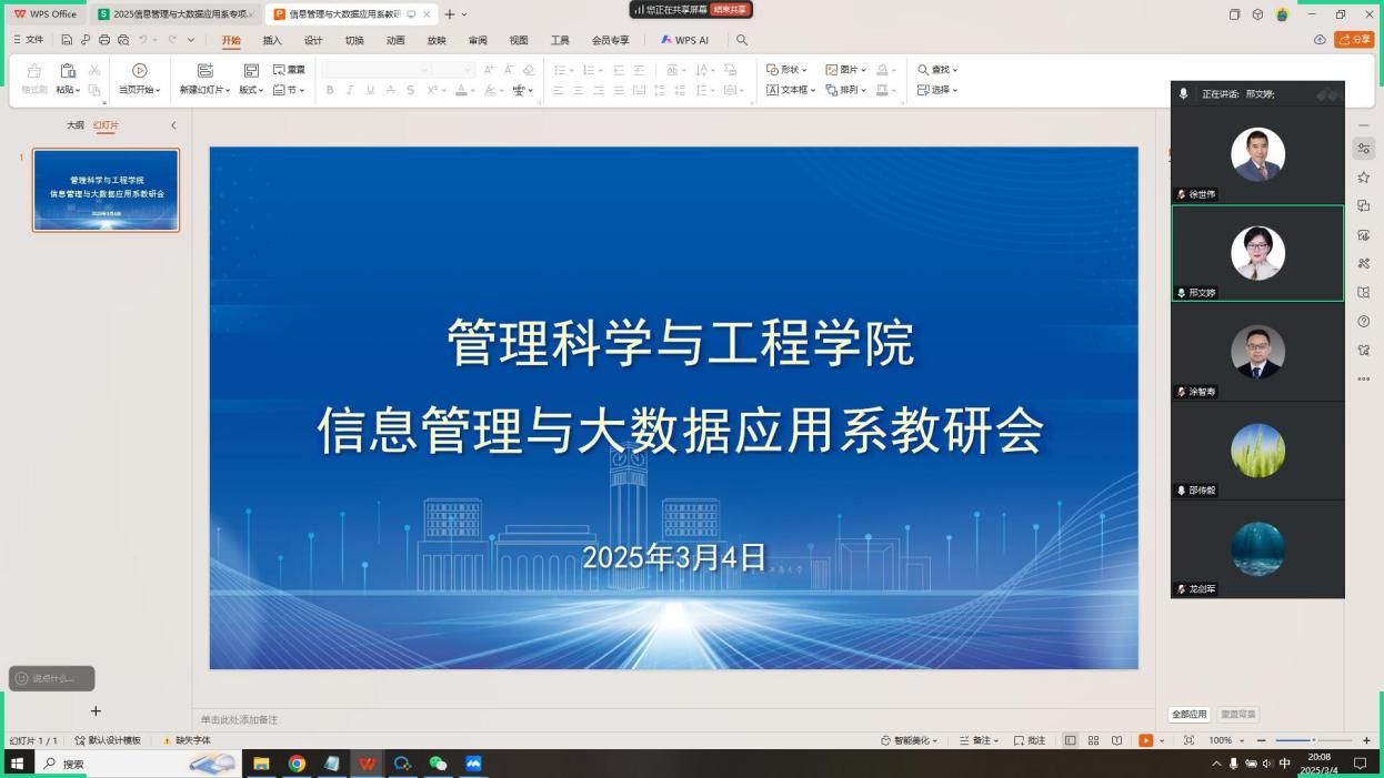 2025年3月4日晚19:30,太阳网集团tcy8722信息管理与大数据应用系成功召开新学期第一次教研会。系主任邢文婷、副系主任郑淞尹,以及系部全体教师参加了会议。本次会议聚焦新学期重点工作,包括专业建设、人才培养、教学管理及毕业生就业等内容,明确了各项工作的任务与时间安排,为新学期的教学与管理工作奠定了良好基础。