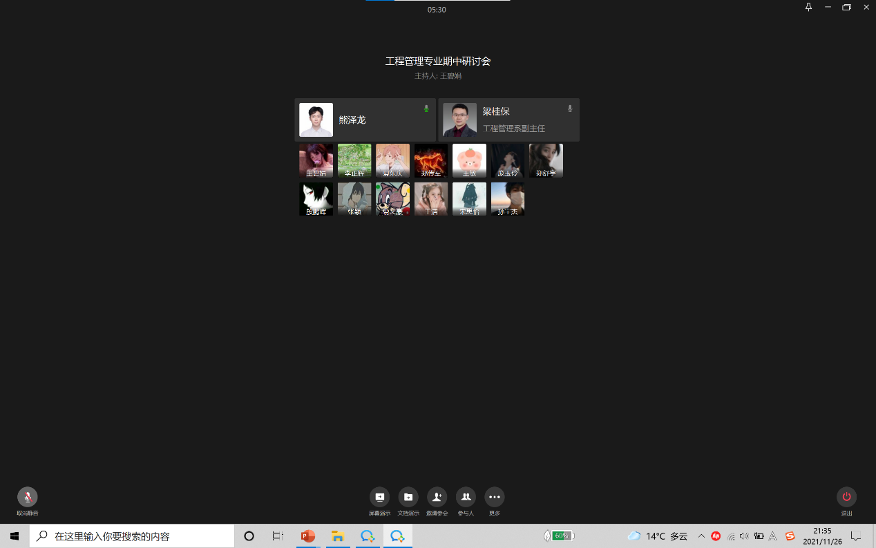 为了充分了解工程管理系教师的教学实际情况并掌握工程管理专业员工的学习及生活状态,2021年11月26日21:30工程管理系以线上方式举办了工程管理专业期中教学交流会。参加本次会议的有工程管理系副主任梁桂保老师、郑传军老师,以及工程管理专业2018级、2019级、2020级和2021级员工代表共15人。