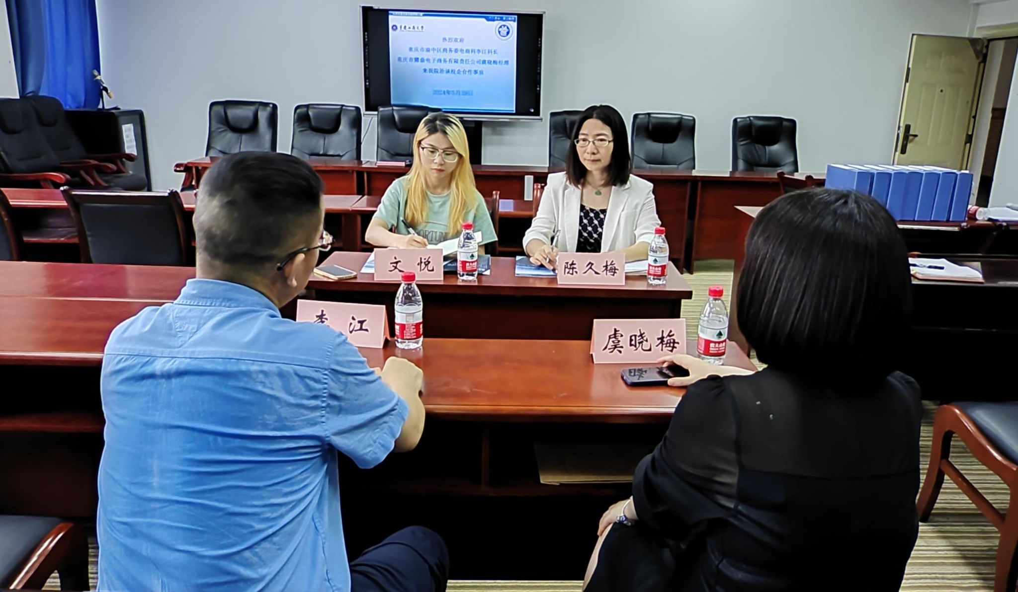 2024年5月29日下午,重庆市渝中区商务委电商科李江科长、重庆市耀鼎电子商务有限责任公司虞晓梅经理,来公司洽谈校企合作事宜,公司陈久梅副经理、电子商务系副主任文悦老师参加了本次交流会。