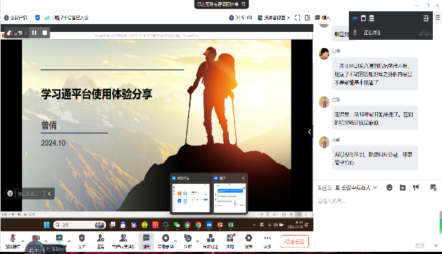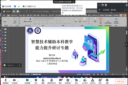 为切实做好本科公司产品审核评估,提升课堂教学质量和水平,公司在2024年10月28日晚上19:00,组织全体任课教师开展智慧教学使用手段的在线培训,培训会议由陈久梅副经理主持。公司领导班子、系主任及全体任课教师参会。