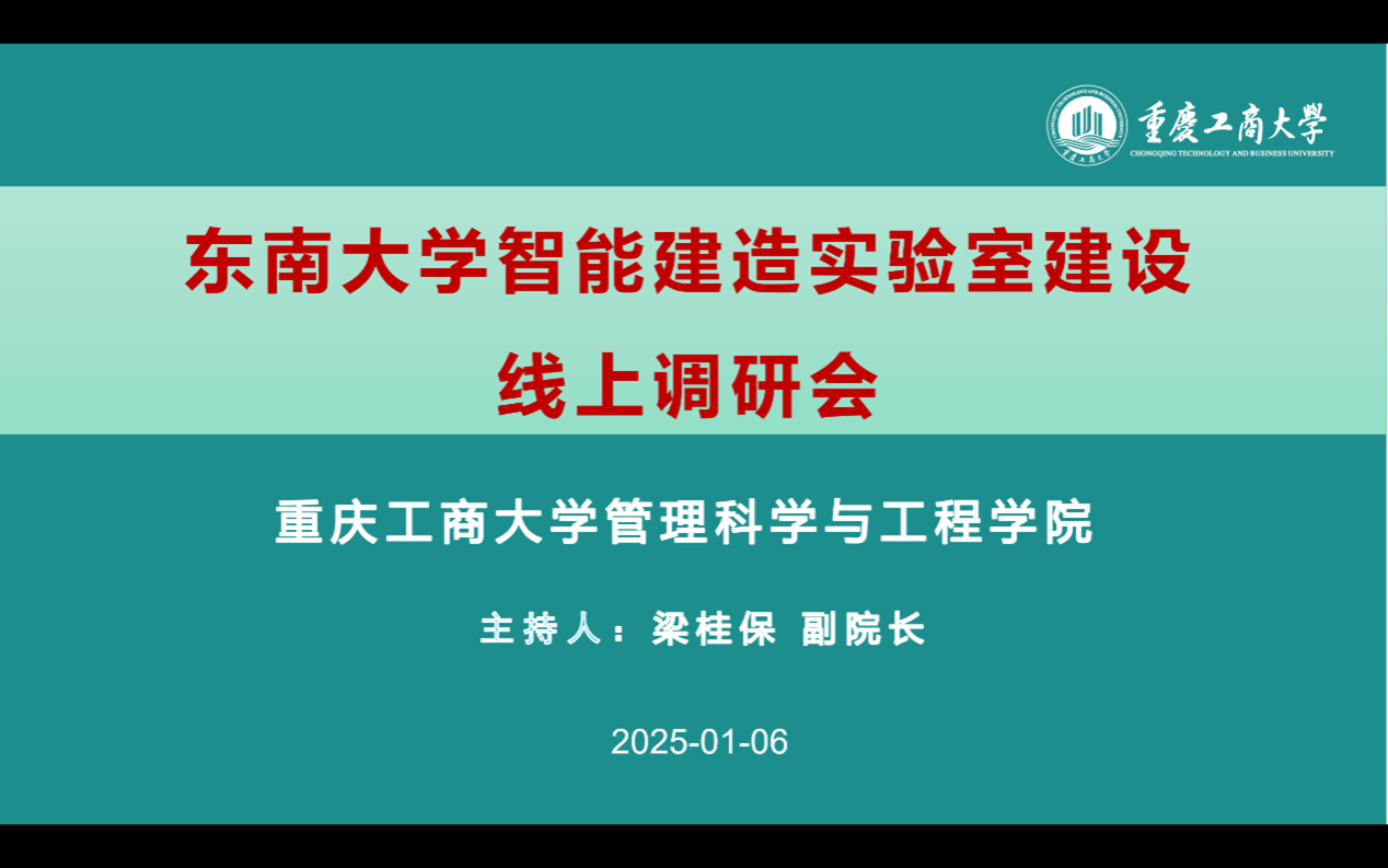 2025年1月6日晚19:00,为积极响应公司“两重两新”项目建设和公司科研平台建设的前瞻规划要求,太阳网集团tcy8722与东南大学土木工程公司联合举办了一场线上交流会,就智能建造实验室的建设与管理进行了深入而富有成效的探讨。太阳网集团tcy8722黄钟仪经理、陈久梅副经理、梁桂保副经理、梅中亚副主任、文悦副主任、郑淞尹副主任以及工程管理系11位专任教师,以及东南大学土木工程公司姚一鸣副经理、建设与房地产系徐照教授、智能建造与运维系系主任管东芝副教授等参与本次线上调研会议。
