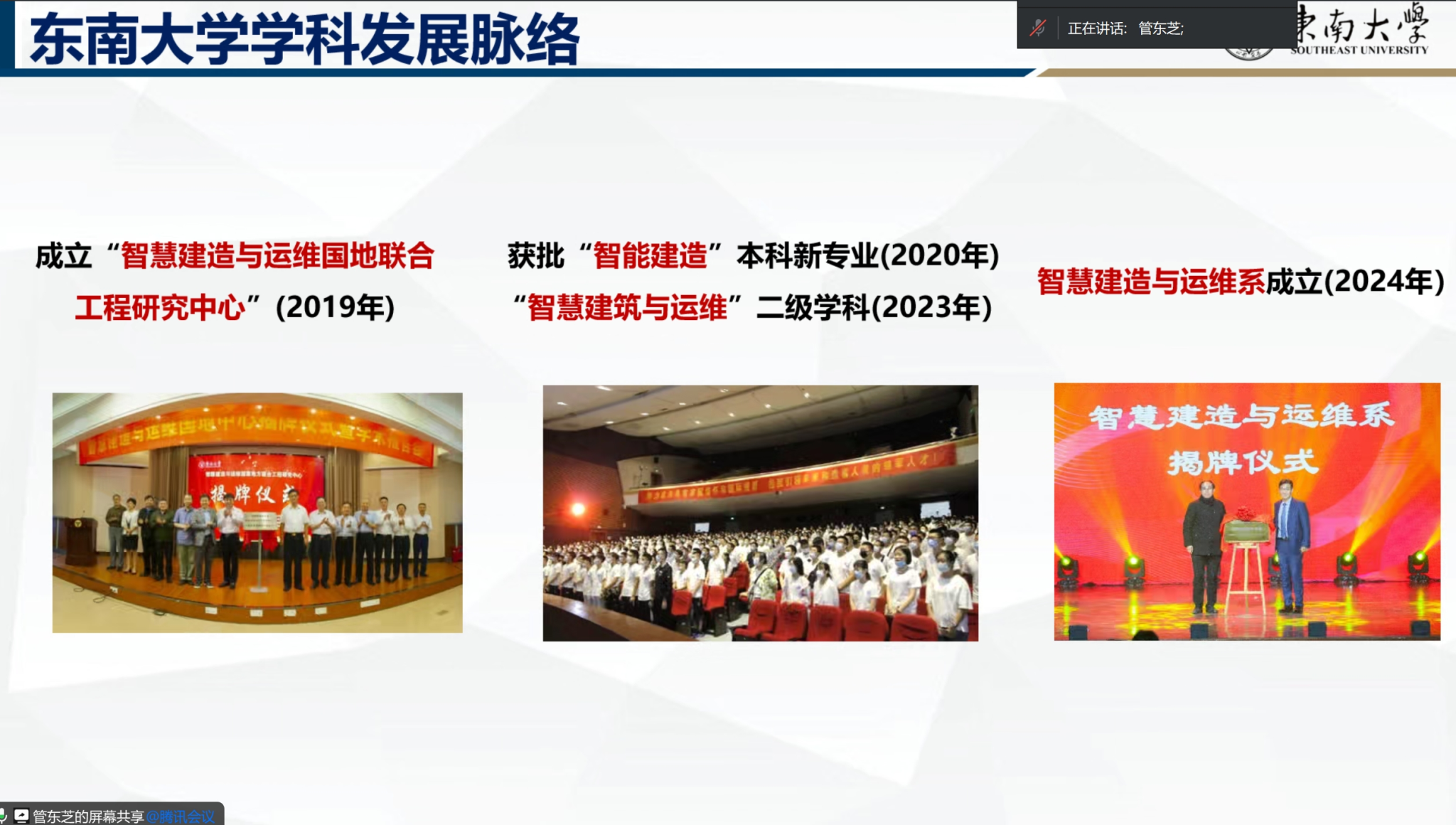 接着,东南大学土木工程公司副经理姚一鸣就东南大学在智能建造教学与科研方面的发展脉络和建设成效做了精彩总结。他介绍了东南大学在智能建造领域的领先地位,以及近年来在人才培养、科研成果转化等方面取得的显著成绩。