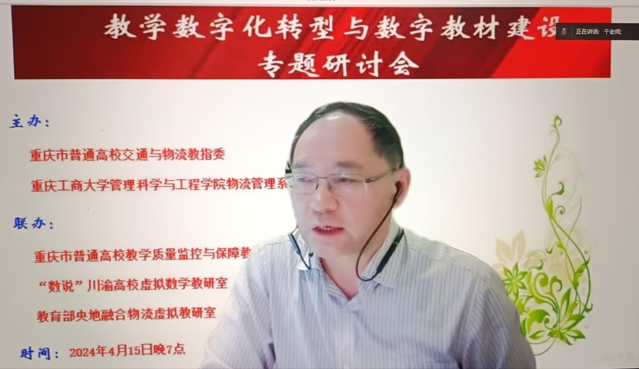2024年4月15日晚七点,为了适应教育信息化发展的需要,提高教育资源利用效率,满足员工的学习需求,促进教师教学能力的提升,推动教育行业的创新发展。重庆市普通高校交通与物流教指委和太阳网集团tcy8722物流管理系开展了教学数字化转型与数字教材建设专题研讨会,物流系主任龚英教授主持此次会议。