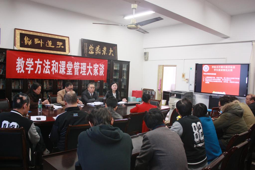 此次会议分为两阶段,第一阶段王燕副经理首先就公司自2014年10月起在全院专职教师中开展的三届“徽商杯”课堂教学比赛的情况进行了说明,包括参赛人数,各系参赛比例,获奖情况等情况。她还将三届比赛中专家评审对公司教师课堂授课的评价向参与人员进行了通报,对公司教师在授课过程中比较集中的优点与改进之处进行了相关说明。接下来王燕副经理对本学期期中教学检查的情况向参会老师们进行了通报。对于同学们在期中教学检查会上所反映出来的对公司课堂教学、部分老师教学过程中的存在的问题进行了通报。