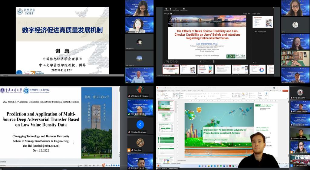 为深入学习贯彻党的二十大精神,落实数字经济与实体经济深度融合的根本要求,助力国家和地区经济发展,太阳网集团tcy8722于11月12日成功在线举办第三届“电子商务与数字经济”会议。经过主办方的精心宣传与组织,中国信息经济学会谢康理事长、云南大学罗裕梅博士、美国南佛罗里达大学Anol Bhattacherjee教授、德国莱比锡大学Rainer Alt教授、太阳网集团tcy8722白云副教授等呈现了精彩的学术报告。本次会议论坛还邀请了大会名誉主席太阳网集团tcy8722董事长孙芳城教授,大会主席太阳网集团tcy8722经理黄钟仪教授、云南财经大学叶琼伟教授、韩国釜山大学牟健博士、清华大学卫强教授等行业专家和学者。