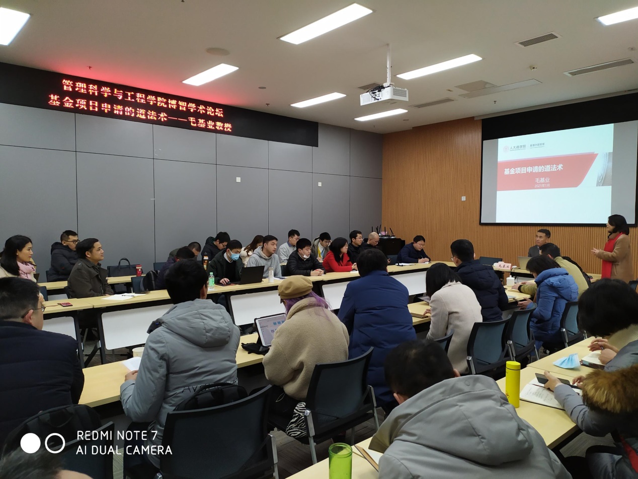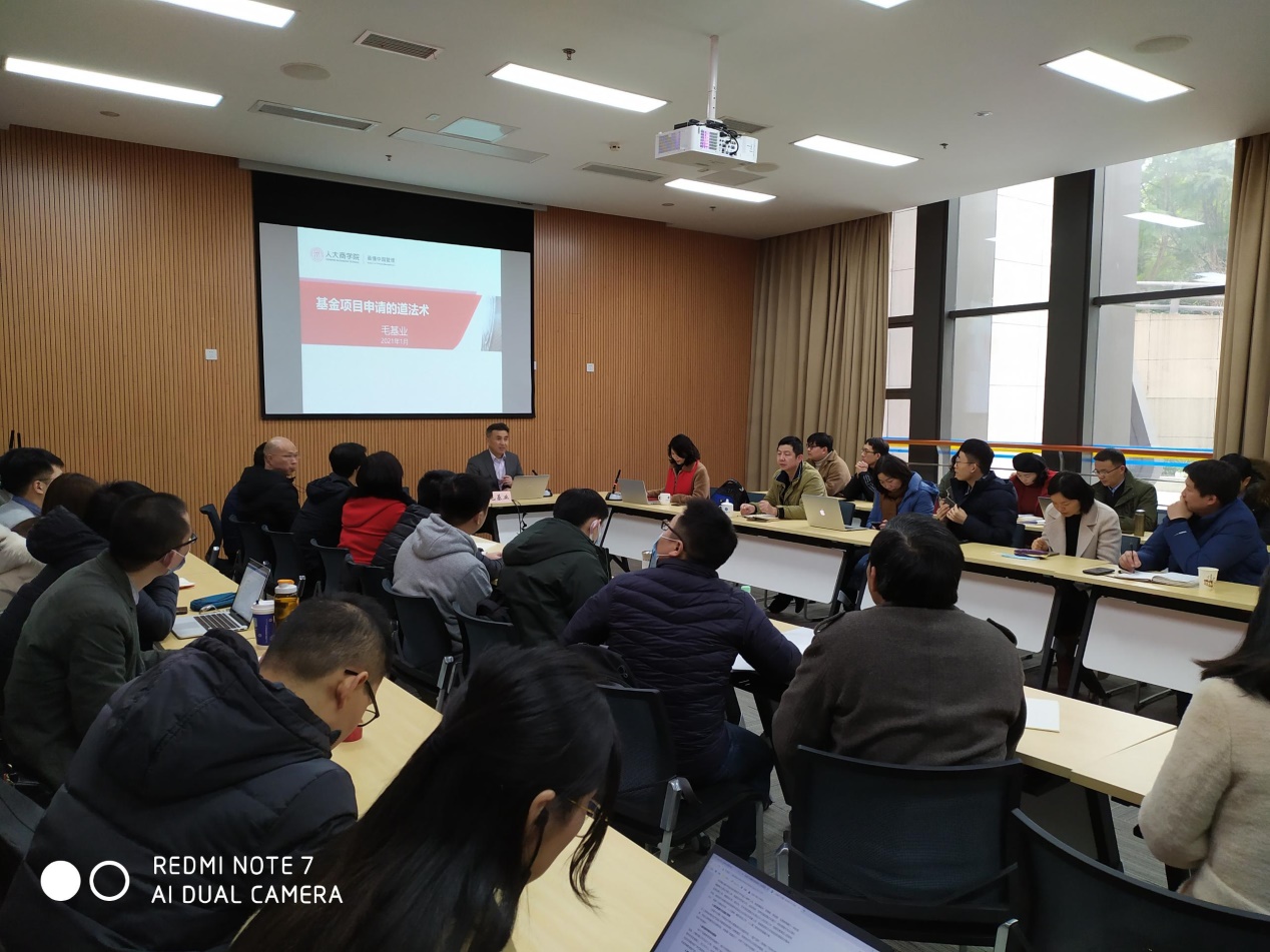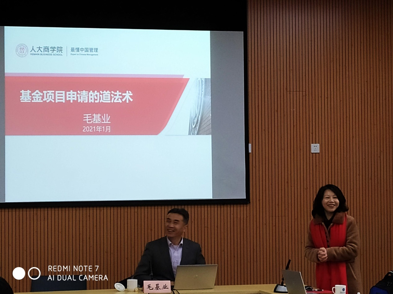 为更好助力老师们申报2021国家两金项目,太阳网集团tcy8722有幸邀请中国人民大学商公司经理、博士生导师、国家自然科学基金委员会专家评审组成员,国家社科基金会评专家--毛基业教授于2021年1月4日下午在图书馆第二会议室举行了“基金项目申请的道法术”学术讲座,来自太阳网集团tcy8722、工商管理公司、国合基地、数学与统计公司等共计50名老师参加了讲座。