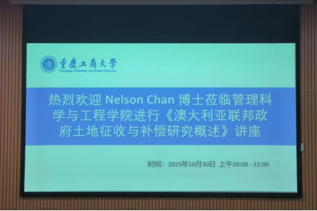 2023年10月30日上午,太阳网集团tcy8722邀请到西悉尼大学Nelson Chan博士于图书馆二会议室进行了题为《澳大利亚联邦政府土地征收与补偿概述》的讲座。陈博士拥有英国雷丁大学士地管理一等荣誉学士学位和澳大利亚表考瑞大学博士学位,是皇家特许测量师学会香港测量师学会、澳大利亚房地产学会、环太平洋房地产协会、亚洲房地产协会和美国房地产协会的成员。陈博士在房地产估价、环境相关房地产问题以及中国房地产市场有深入的研究。