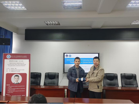 在讲座中,梅中亚老师从施工现场的建筑临时设施布局网络、施工管理决策等方面进行了详细讲解,与在场的师生们进行了交流互动。首先,他提出在施工现场布局规划优化的现实问题,并阐述了施工现场布局规划优化的理论问题运用的场景。接着,梅老师指出,施工现场布局规划优化算法的研究中,还应将降噪、废弃物污染、工人人身安全、施工现场道路和空间等因素都考虑到模型中。随后,梅老师就优化目标以及对应的计算方法进行了剖析,并指导在场的同学搜索相关文献、寻找研究的创新点,详细介绍曼哈顿距离、欧氏距离等常见的启发式距离可用于物流的路径规划、优化问题、人工智能搜索算法中。最后梅中亚老师针对如何应用施工现场中的优化算法进行了总结。