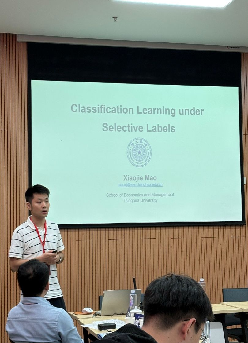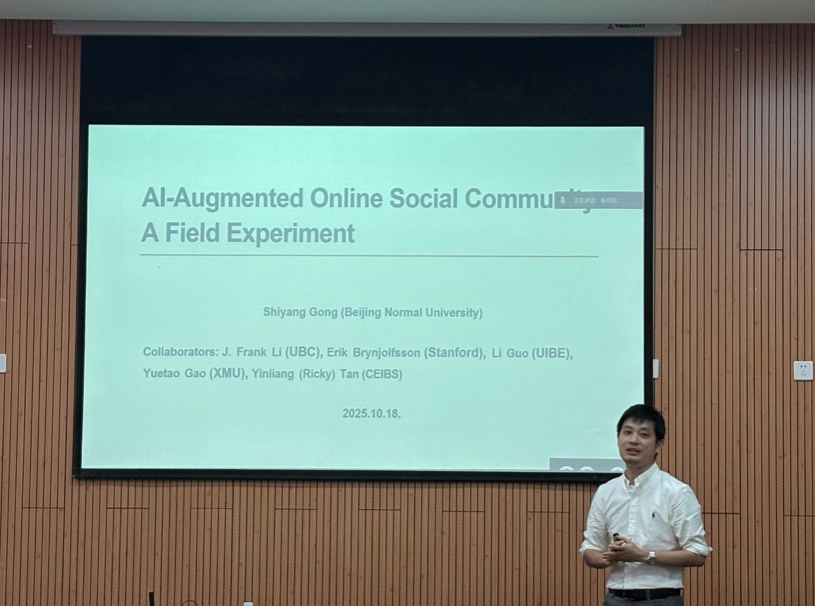 在“数智商务”分论坛中,北京师范大学白璐教授、北京师范大学龚诗阳教授、华南理工大学刘思源教授、清华大学毛小介副教授、北京航空航天大学卓越百人博士后朱天宇,分别以“基于结构模式识别的金融复杂网络分析研究”“人工智能增强型线上社群”“The Role of Monitoring Effect in Risk Classification: Evidence from Telematics Adoption”“Classification Learning under Selective Labels”“鱼与熊掌,亦可兼得:推荐系统点击率预测中的公平性与精度共赢”为主题作报告。