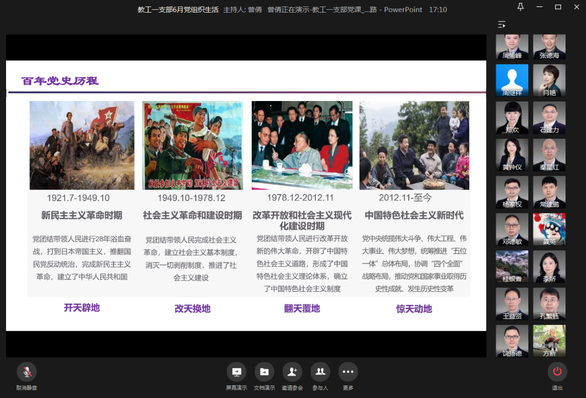 首先,按照公司党史学习教育要求,由教工一支部书记曾倩同志讲党课,主题为《中国共产党百年探索之路》。曾倩同志带领大家回顾和学习了中国共产党百年历史,提出中国道路是中国共产党领导中国人民进行新民主主义革命,进行社会主义改造,实现向社会主义转变,建设社会主义现代化强国,实现民族伟大复兴的道路。百年历史主要包括四个阶段:第一个阶段,是从1921年中国共产党成立到1949年新中国成立,是中国共产党领导中国新民主主义革命的28年,打倒日本帝国主义、推翻国民党反动统治,完成了开天辟地的救国大业;第二个阶段,新中国成立以后,从1949年到1978年是社会主义革命和建设时期;第三个阶段开始于1978年12月,中国共产党召开了具有重大转折意义的十一届三中全会,确立了以经济建设为中心、实行改革开放的重大决策;2012年随着十八大的召开,中国特色社会主义进入新时代,到现在我们全面建成小康社会,进入第四个阶段。今年是中国共产党成立100周年,同时今年又是一个重要的节点,要开启第二个百年,就是到2050年把中国建成为社会主义现代化的强国,在这两个百年的交接点学习中国共产党100年的历史确实具有非常重要的意义。