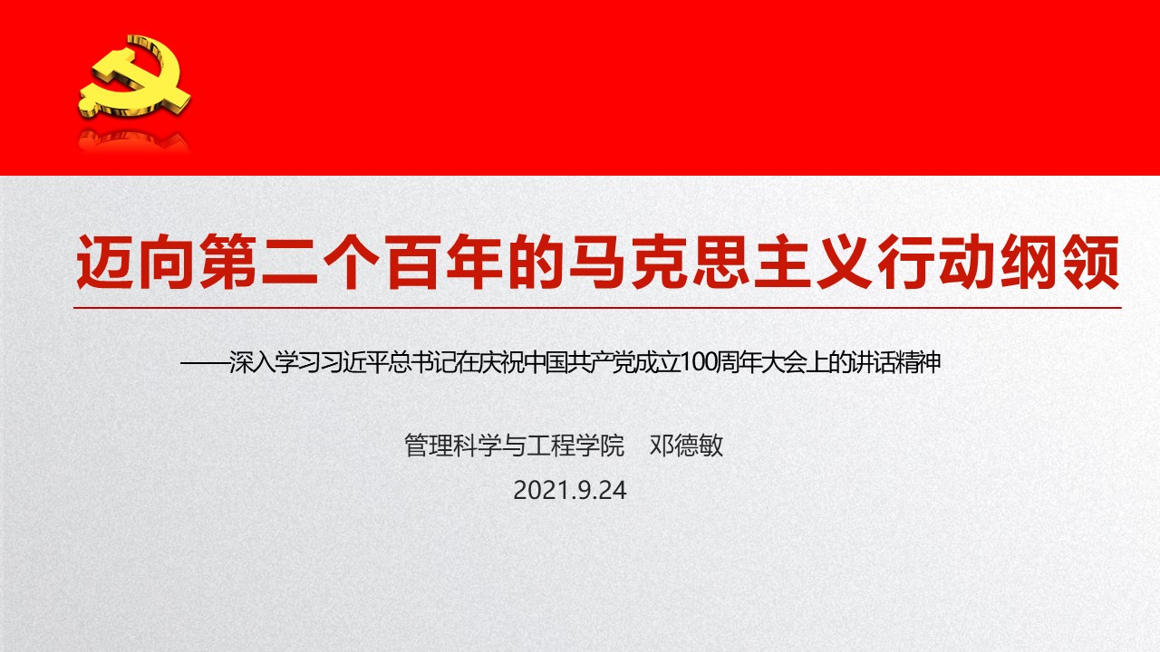 邓德敏从习近平总书记“七一”重要讲话的意义、“七一”重要讲话的鲜明特征、“七一”重要讲话的重大理论创新和深刻践行“七一”重要讲话精神等四个方面进行了宣讲。邓德敏讲到,习近平总书记“七一”重要讲话是一篇站在“两个一百年”奋斗目标历史交汇点回顾党的光辉历程,总结党的奋斗历史、主题及取得的伟大成就的重要政治文献,也是一篇推进马克思主义中国化的重要政治文献,向全国人民发出了全面建设社会主义现代化强国的动员令。“七一”重要讲话充满了马克思主义的政治智慧,彰显了坚定的自信,充分体现出伟大的斗争精神。他从为什么要坚持中国共产党领导的“四个是”、“三个从来不代表”、伟大建党精神、中国式现代化道路、人类文明新形态等五个方面解读了“七一”重要讲话的重大理论创新。
