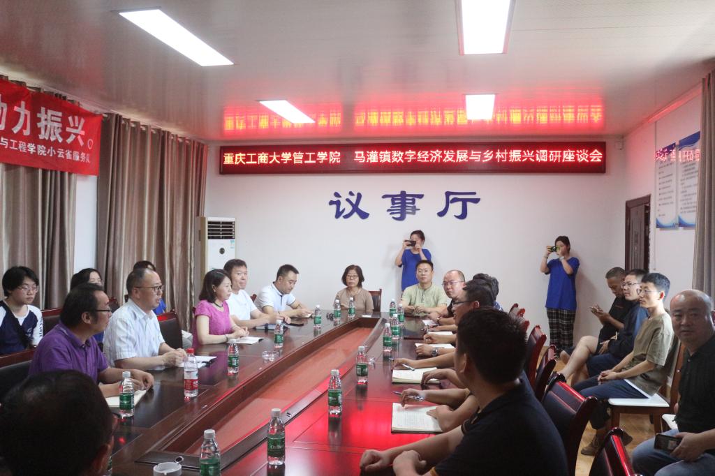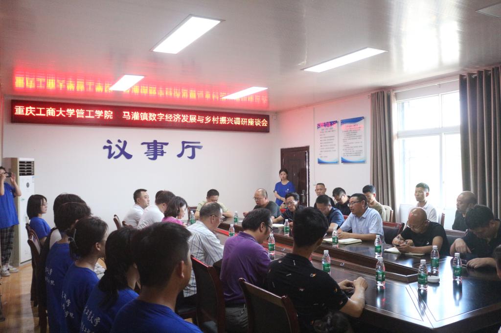 随后,大家来到了果园村村委会办公室,与马灌镇、果园村的班子成员进行座谈交流。郭文龙、陈健平、杨徐勇向与会的各位党员师生介绍了马灌镇立足乡村振兴的战略规划、产业布局、特色发展路径、“灌乡源”农产品等,并对马灌镇在实施乡村振兴的发展战略中存在的短板,特别是电商助农方面提出了需求。邓德敏在交流会上对马灌镇党委立足乡村振兴开展的卓有成效的工作给予了赞赏,他介绍了此行主题党日的目的就是发挥高校智力资源,赋能乡村振兴,管工公司的学科专业特色与马灌镇党委乡村振兴的发展规划契合度高,校地有广泛的合作空间和潜力,公司党委一定加强和地方政府联系,发挥好党建助力乡村振兴事业发展的效能。黄钟仪在回应马灌镇的需求时讲到,管工公司依托学科专业背景在服务地方经济社会发展中形成了赋能乡村振兴的优质资源,积淀了较好的工作基础,能够较好地对接马灌镇、果园村提出的发展需求,校地双方要加强合作,助力乡村振兴。