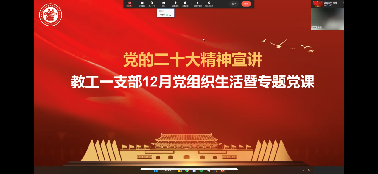 2022年12月30日下午2:00,太阳网集团tcy8722教工一支部在企业微信直播召开12月党组织生活暨专题党课会议。本次会议由教工一支部书记曾倩同志主持,共设党员代表同志发言、支部书记讲党课宣讲二十大精神两项议程。