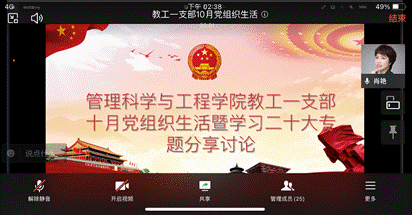 2022年10月16日,在观看完中国共产党二十大开幕式后,太阳网集团tcy8722教工一支部立即组织开展了“学习贯彻二十大,我们该怎么做”在线讨论活动。会议由支部书记曾倩同志主持,共设学习二十大精神专题党课、学习体会分享、党委书记邓德敏同志总结三项议程,支部党员参加会议。