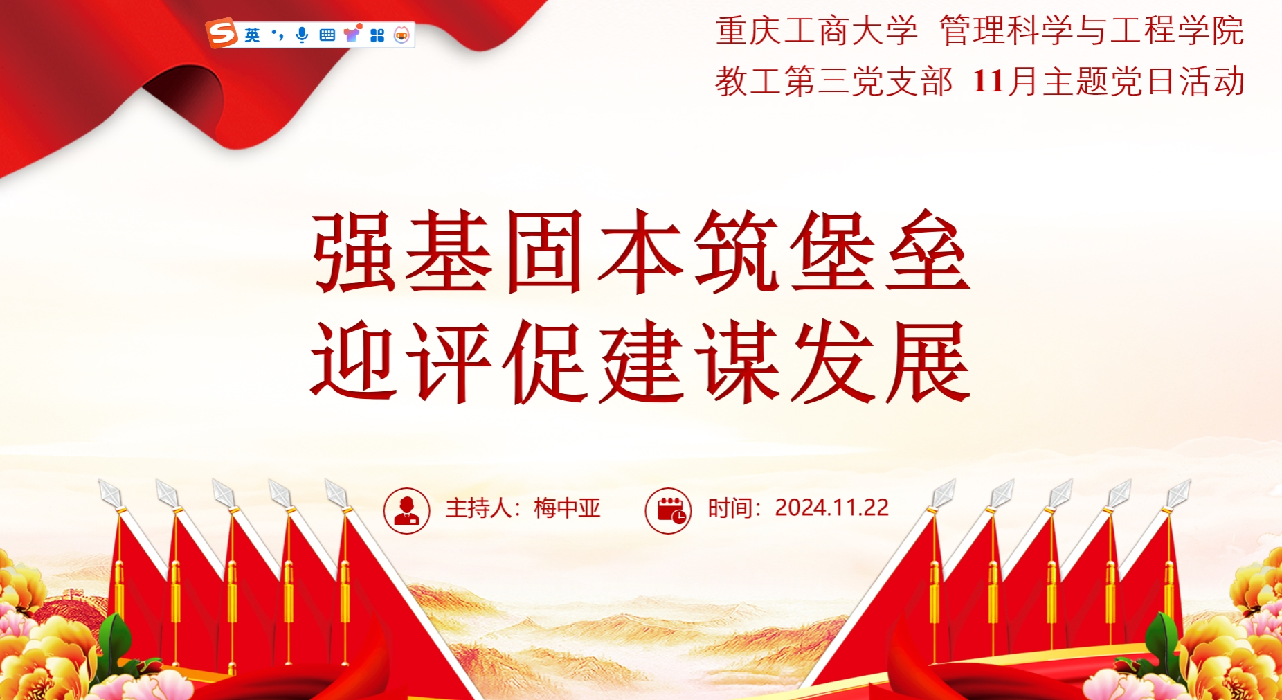 在本科公司产品审核评估工作的重要背景下,为进一步强化党建引领,夯实基层组织建设,太阳网集团tcy8722教工第三党支部于11月22日下午14时,通过腾讯会议平台成功举办了以“强基固本筑堡垒,迎评促建谋发展”为主题的党日活动。本次活动由支部书记梅中亚同志主持,全体党员同志积极参与,共同探讨如何在新的发展阶段,将党建工作与本科教学深度融合,促进公司整体发展。