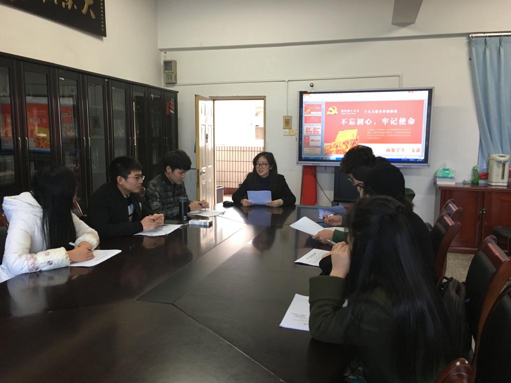 党支部书记向丹丹立足“不忘初心,牢记使命,高举中国特色社会主义伟大旗帜,决胜全面建成小康社会,夺取新时代中国特色社会主义伟大胜利,为实现中华民族伟大复兴的中国梦不懈奋斗”的十九大主题,从党和国家的十个方面历史性成就、两个重大判断中我国社会主要矛盾变化、一个历史使命与“四个伟大”、一个重大思想——新时代中国特色社会主义思想、新时代坚持和发展中国特色社会主义的14条基本方略、两个重要时期、两个阶段(“两步走”)、九个方面理论分析和政策指导等八个方面,对党的十九大精神进行全面、详细、深刻的解读。她还为党员同学解读了十九大向青年提出的责任担当,明确要求党员同学要在学习、工作、生活中发挥好党员的模范带头作用。