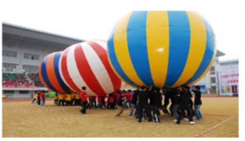 【比赛方法】比赛前,参赛队员共同托起大球立于起跑线后。裁判发令后参赛队员共同托着大球冲向终点,赛道全程30米。途中不允许换人,以球体全部到达终点为准,按用时进行排名。