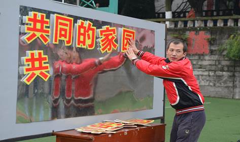 【比赛方法】参赛人员需赤脚,头戴安全帽在指压板上跳跃扎破放置在网内的气球。在规定的时间内,6人交替扎放置在球网内的气球,扎破一个需换人继续。