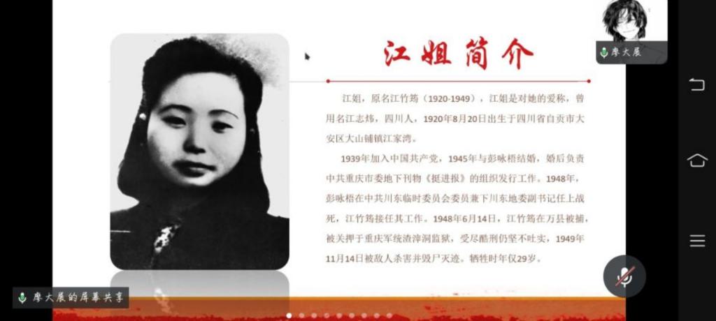 在党员服务站全体成员的充分准备下,分享活动于3月29日21:00准时在企业微信召开。同学们通过在网上收集红色故事,红色人物事迹,并制作PPT在分享会上展示,共同领略时代先锋们的风采,学习先辈们的伟大精神。其中取得优异成绩的廖大展同学分享了中国革命烈士——江姐的故事,同时也发表了他个人感悟。观众们受到红色人物的魅力感染,号召同学们学习先辈,向着未来不断前进。更要满怀感激的心情,永生铭记老一辈共产党人为民族独立、人民解放英勇斗争的革命精神;要沿着老一辈共产党人留下的脚印,发扬“八一”精神,用实际行动来体现共产党员先进性;要继承老一辈共产党人优良传统,为国家、为人民贡献毕生力量。通过本次线上分享会,同学们充分理解到革命胜利的来之不易,大家应当以革命先辈为榜样,继承先辈们矢志不渝的精神,结合自身实际行动,继续传承发扬红色精神。最后,工作人员评选出优秀分享者,并为获奖者颁发了奖状。