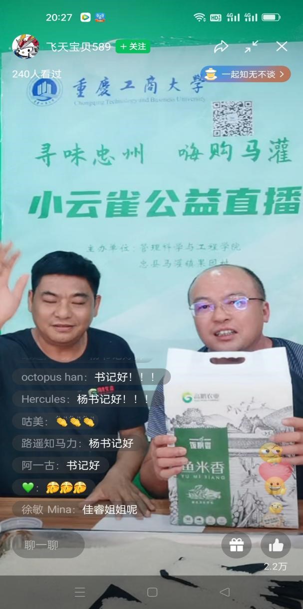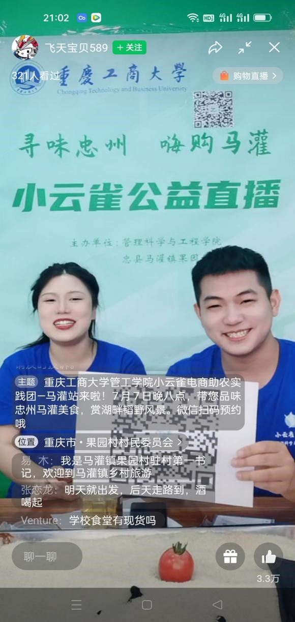 在田间地头的多次调研和直播方案的反复修改的基础上,7月7日,小云雀服务队的老员工们精心准备的“寻味忠州,嗨购马灌”公益直播在忠县马灌镇果园村高鹏农业直播间开播。老员工主播们幽默风趣、青春活泼。他们从产品生产过程、产品特点和产品食用方法等多个角度介绍忠县马灌镇农特产品,并极力推荐马灌镇重点打造的“灌湖水乡”公众号。马灌镇果园村驻村书记杨徐勇和高鹏农业董事长周玉高也来到直播间,为老员工主播助力。
