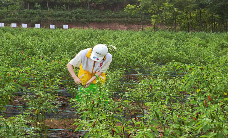 图为周云群在示范基地采摘辣椒 通讯员 周云群 摄