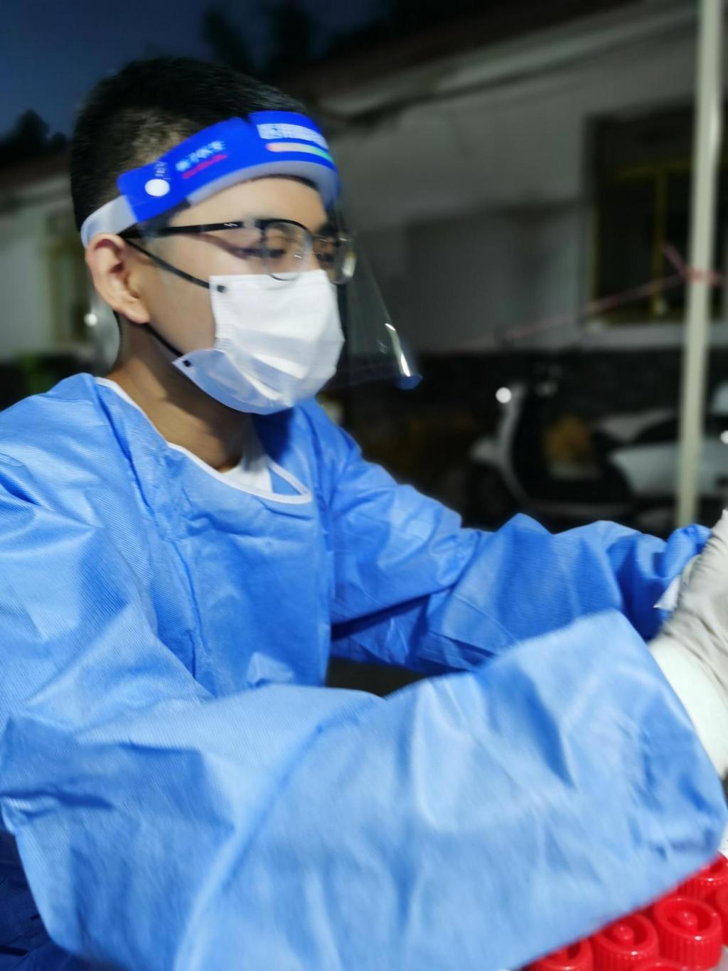 为有效防止高温条件下志愿者、其他工作人员以及社区居民们中暑生病,志愿者们的工作在早上4点准时开始,必须在9点前结束。第一天成为志愿者,张强同学的主要工作是登记信息、为现场人员检测体温、帮助社区工作人员维护秩序等。他坦言道,高温天气下穿着防护服做着高强度的工作是一件很痛苦的事。在密闭的防护服中坚守一上午,若有人中暑,会立即安排治疗并让其他人员接替工作;若有居民不配合工作,社区工作人员会第一时间与其进行沟通;遇到物资紧缺,群众们自发联络并收集物资。志愿工作虽艰苦,但没有人退缩,每个人都坚守在自己的岗位上,从不松懈半分。工作结束后每个人都一身汗水,手在防护服中被汗水泡的发白也绝不抱怨,每个人都为自己的工作感到自豪。