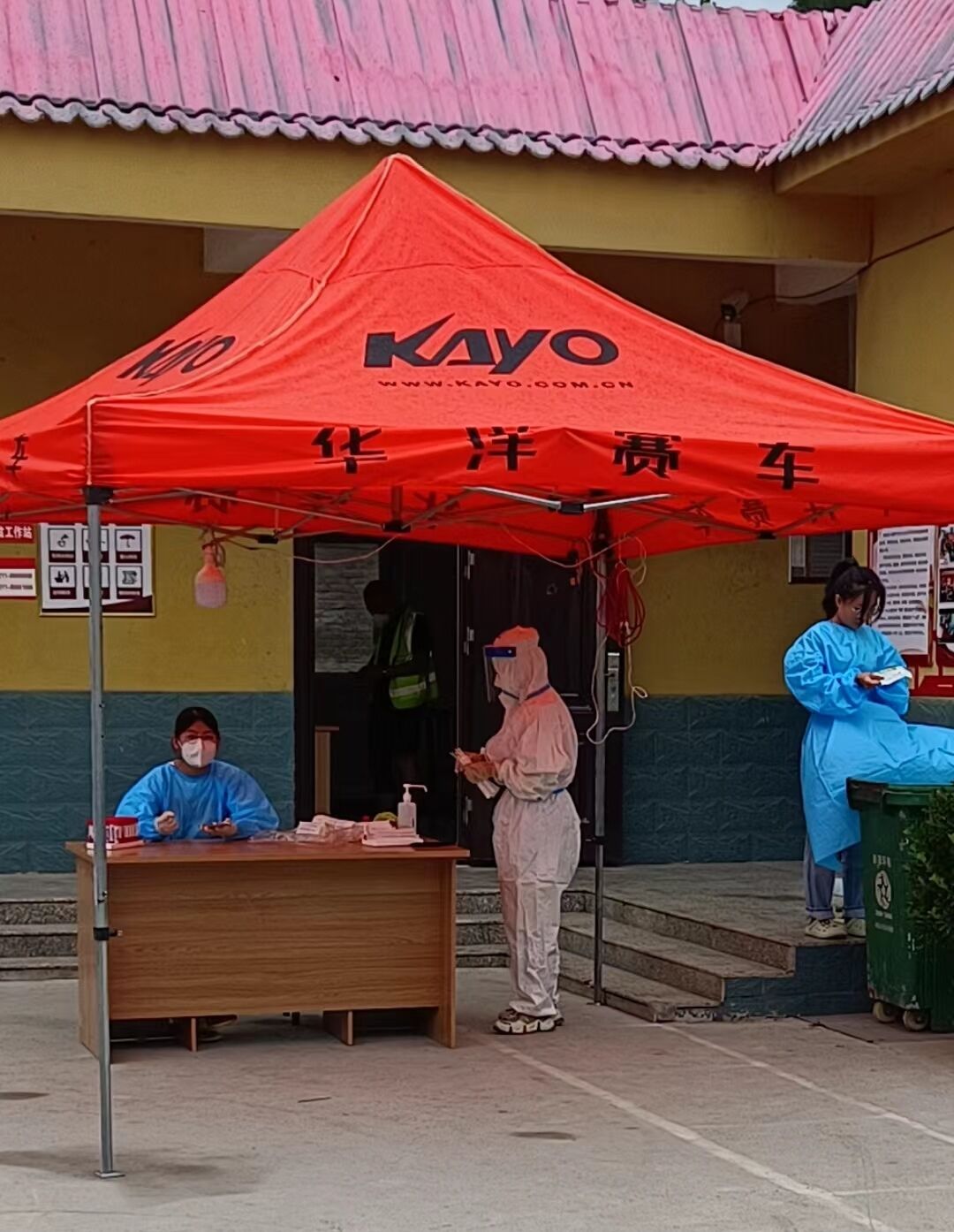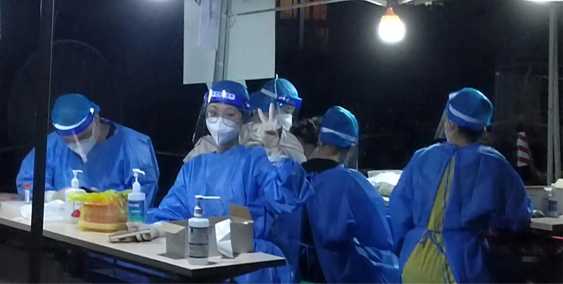 早上五点半,她跟随防疫工作人员开始整理物资,区域消毒并换上防护服,在六点钟正式开始核酸检测。防疫人员的工作分为两个时间段,6:00至12:00,下午从18:00持续到23:00结束。