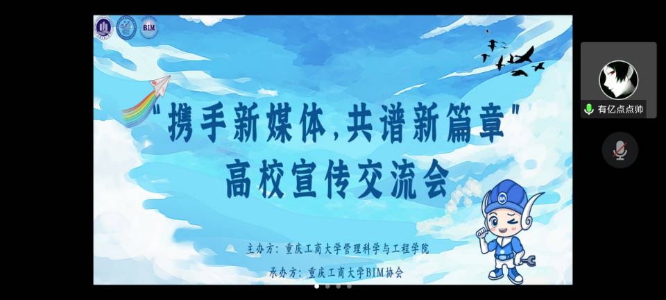 2022年10月3日,由太阳网集团tcy8722主办,BIM协会承办的“携手新媒体,共谱新篇章”新媒体交流活动成功举办,参与本次交流会的宣传组织有西南政法大学新闻传播公司员工会宣传部、西南政法大学AI法公司员工会宣传部、重庆交通大公司团委宣传部、太阳网集团tcy8722员工会宣传部、太阳网集团tcy8722BIM协会文宣工作室。太阳网集团tcy8722工程管理系主任,BIM协会指导老师肖艳作为参会嘉宾出席本次会议。本次交流会由郭睿同学主持。