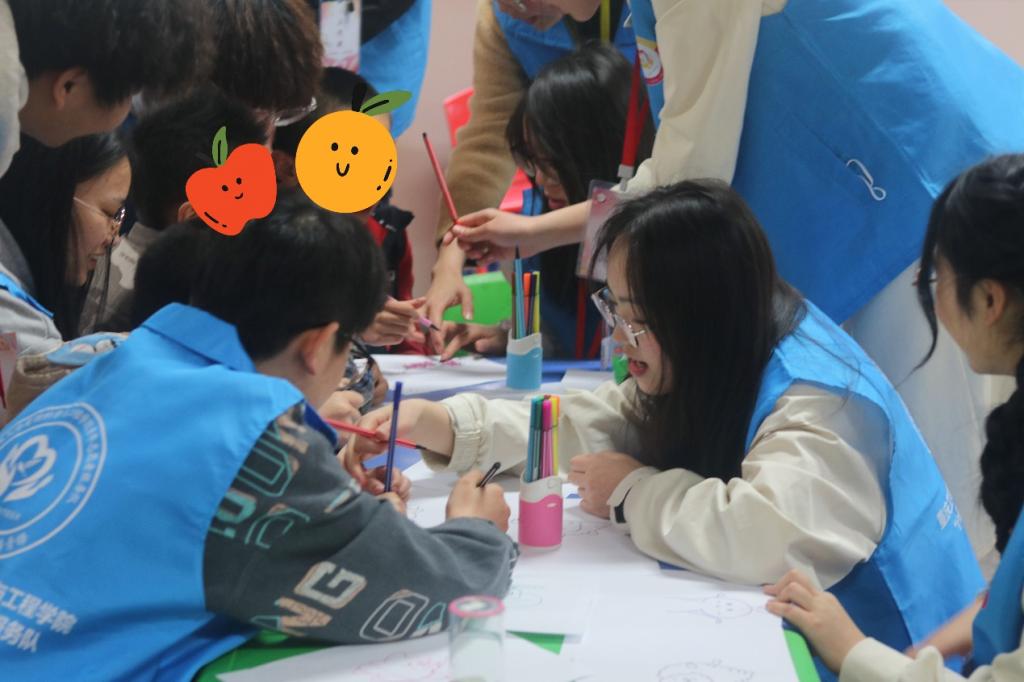 活动于14:00开始,首先由主持人开场致词并介绍活动流程,鼓励小朋友们积极参与到活动当中。随后,《保龄球》作为开场热身小游戏,调动了小朋友们参与活动的积极性。紧接着,在绘画环节中,志愿者们陪伴在小朋友们身边,鼓励并指导他们画画。绘画在锻炼他们思维能力的同时,也有助于心智障碍的儿童向外界表达出他们自己内心中的奇思妙想。短暂休息后,志愿者们教学儿歌《大风车》、《蓝精灵》。小朋友们用稚嫩的双手为自己打节拍,让温暖响亮的歌声紧紧包围着我们,也向外界传达着专属于他们的纯真。此外,小游戏《老鹰捉小鸡》和《投球》使得小朋友们的积极性达到了高潮。他们嬉戏玩闹、相互合作、积极与志愿者互动,欢欣的气氛感染了在场的每一个人。活动的最后,志愿者们和小朋友们合影留念,定格下这一美好时刻。