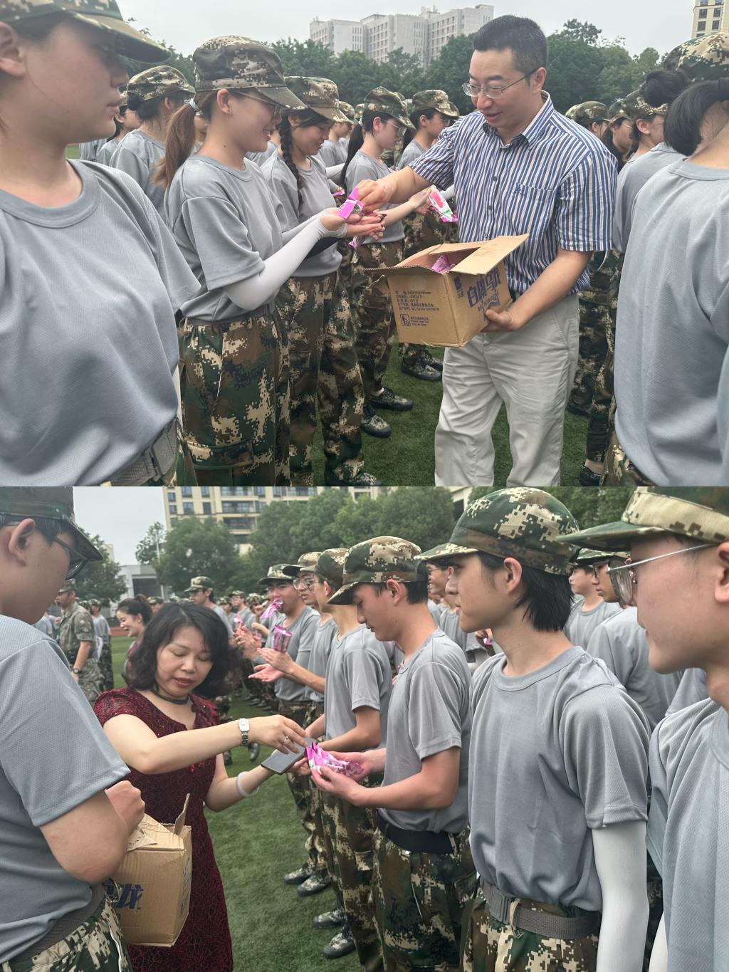 李书记和黄经理首先对同学们坚持不懈的拼搏精神、端正严谨的训练态度、精神抖擞的良好风貌表示了充分肯定,强调军训是公司开展爱国主义教育的重要载体和有效途径,希望同学们能通过军训将自身的爱国精神转化为责任担当、砥砺奋进的强大动力,并勉励同学们要以更加饱满的热情和更加顽强的毅力主动投入到军事训练中,以完成各项军训任务。同时同学们也要留意天气变化,做好防暑防晒,注意劳逸结合。随后,领导老师们为参训学员和承训教官送上了一份“清甜”。在闷热酷暑中,一支支冰凉的雪糕如春风拂过树梢,绿意冒上枝头,极大地鼓舞了同学们的士气,也让大家深刻感受到了来自公司的深切关怀。