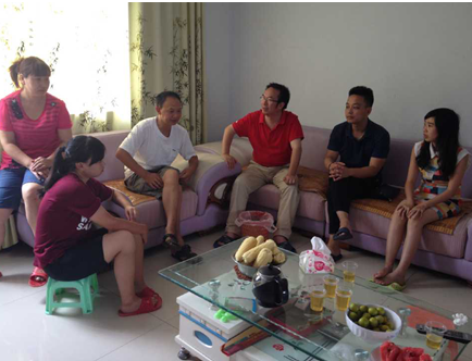 7月20日临近中午时分,叶海林副书记一行来到武隆县城黄美玲家中,向黄美玲父母了解他们对公司的意见和建议。叶海林副书记一行人同黄美玲家人边介绍该生情况,边聊开了家常,气氛甚是融洽。黄美玲父亲激动地表示,家访是一项有利于孩子发展的好工作,希望公司老师下次家访能够再到武隆来看看,到家中来坐坐。在得知黄美玲父亲几年前曾因手术花费几十万,家庭陷入困境时,叶海林副书记当即为该生解决了实际困难,鼓励黄美玲积极克服困难,利用假节日参加社会实践,减轻家庭负担的同时,锻炼能力,争取早日成才。