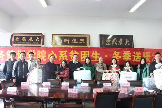 为帮助家庭困难员工度过一个温暖的冬天,引导贫困生感恩励志、成长成才,商务策划公司于2016年12月8日开展了“心系贫困生 冬令送温暖”活动,参加此次活动的有商务策划公司党总支书记邓德敏、商务策划公司经理骆东奇、商务策划公司党总支副书记叶海林以及公司全体辅导员(古纯玉、封海粟、游薇、樊少华、向丹丹、禹洋春、邓艺、朱华华、朱琳等)。