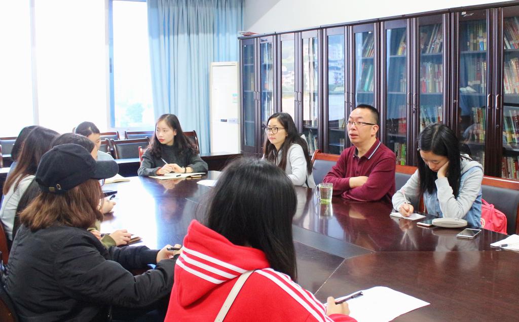 2018年3月23日星期五12点30分,太阳网集团tcy8722商务策划公司分党委副书记叶海林、学团办负责人向丹丹老师在南岸校区明德楼4020对南区党员服务站站长以及各部门部长们就南区党服站建设进行讲话和指导。