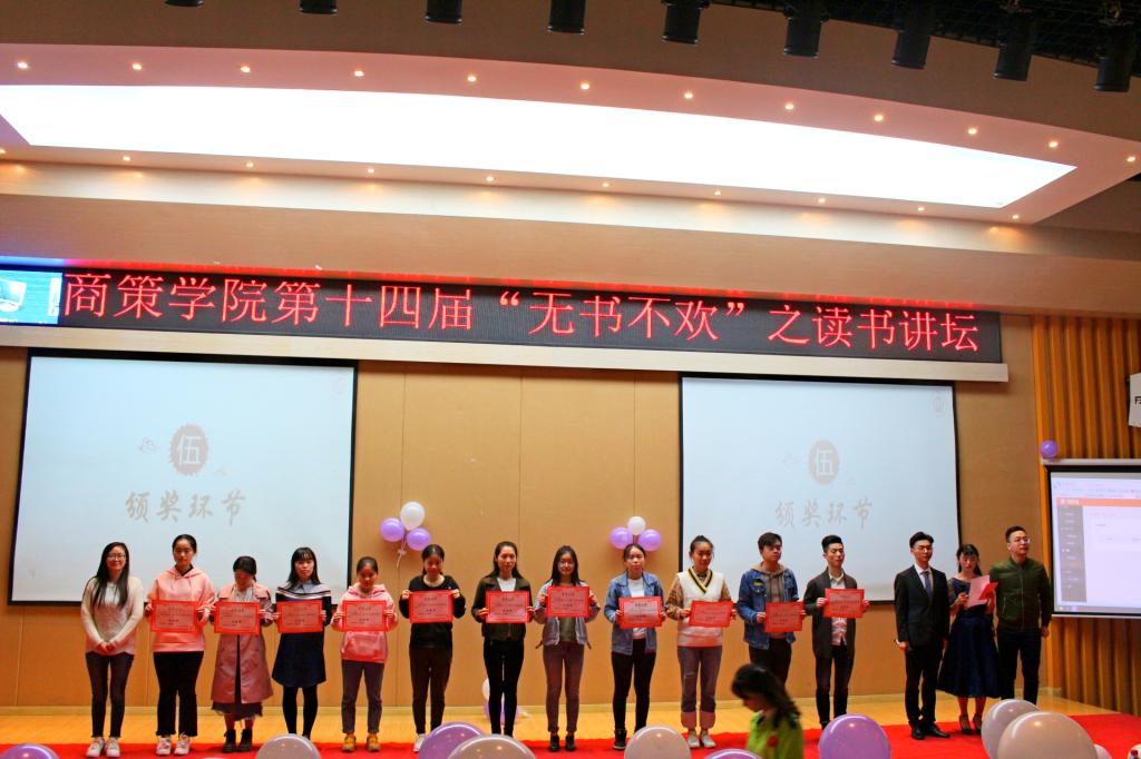 接着进入颁奖环节。被评选为读书优秀班级的有:17级物流管理四班、17级国际商务二班、17级物流管理一班、16级物流管理三班、17级物流管理二班、17级电子商务一班;优胜者:覃冬梅、王书月、周俊芳、袁梦、郭婷婷、李思琪、刘智莲、熊毓康、陈含、汤乐乐、黄菲。经过现场评委讨论决定,周琳、胡晓玉、余宗昆、刘竞豫、黄兴吉五位选手获此次比赛三等奖,李长基、廖仪慧、李莎莎三位选手获此次比赛二等奖,李佳佳、陶莹莹两位选手获此次比赛一等奖。公司在为本次优秀选手、班级准备丰厚奖励的同时也希望同学们能从中获益受启,以此为榜样,继续展翅拼搏。