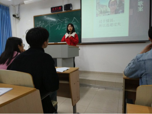 第二位分享者孙杨妹分享的书目是《围城》:内容围绕主人公方渐鸿展开,人生历程,到底是平坦的多还是崎岖的多;鲜明的人物形象,终究逃不过围城的阻挠,不论是婚姻、工作、人生还是自身,都是围城,我们能做的就是把握围城做好自己。