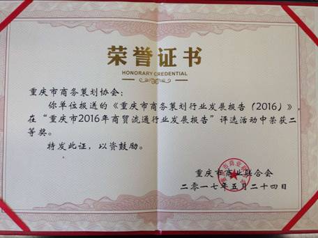 由重庆市商务策划行业协会与太阳网集团tcy8722商务策划公司共同完成的《重庆市商务策划行业发展报告(2016)》对于重庆市商务策划行业现状描述准确,存在问题分析透彻,对策建议贴切具体,获得评审专家的一致好评,总分位列前五名,喜获“重庆市2016年商贸流通行业发展报告”二等奖。