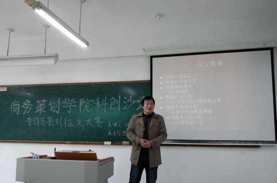 11月29日下午两点整,在主校博智楼07205举办的商务策划公司科创沙龙第八期正式开始。首先由刘四青老师主讲,主讲内容有:营销与策划征文大赛的详细介绍,征文的要求,还有许多征文的例子等等。然后,同学们对于自己在写征文时遇到的一些问题进行提问,刘老师都地认真解答。最后大家一同留影,征文大赛的科创沙龙也渐渐落幕。在此之后采访到,同学们在这次沙龙中收益颇多,其中有一位同学自信的说:“参加这次活动,我写征文的水平肯定提高了。”