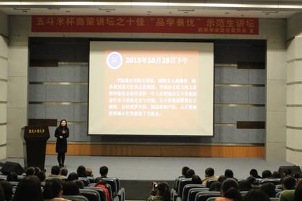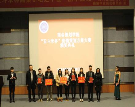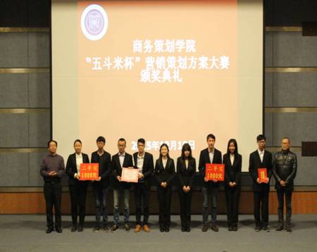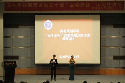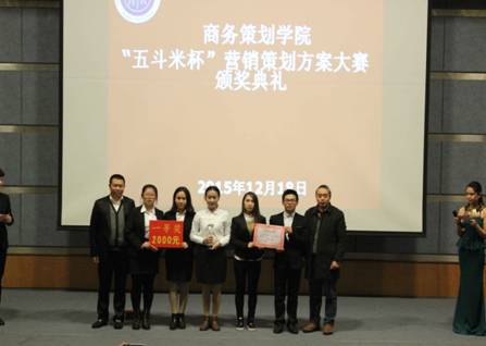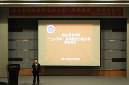 2015年12月18日15:00,商务策划公司“五斗米杯”营销策划方案大赛颁奖典礼在博智楼7100学术报告厅召开,应邀出席本次颁奖典礼的嘉宾有“五斗米”集团董事长王顺海先生、首席高级咨询顾问袁靖杰先生、总经理罗开林先生、商务策划公司经理骆东奇教授、副经理王燕教授、党总支副书记叶海林,以及营销策划研究会指导老师邓艺。